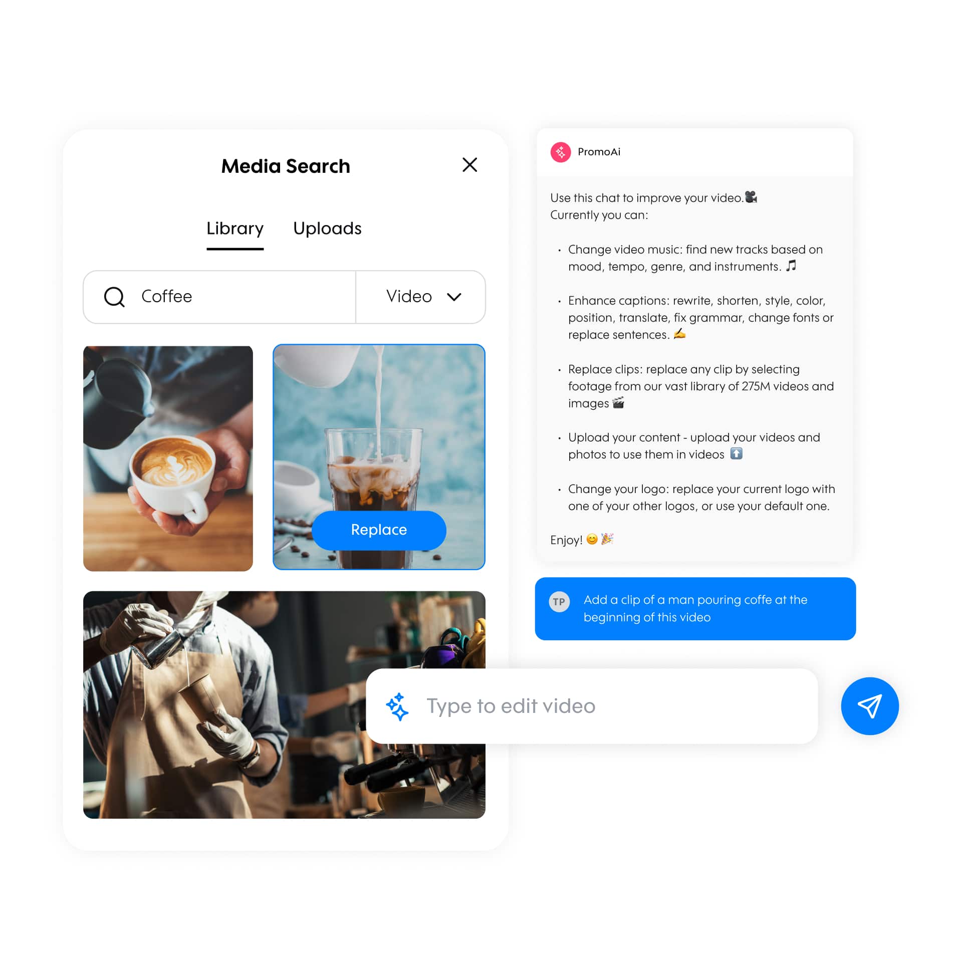 Everything! You can add, remove, and trim video clips to fit your vision. Write and edit video text, incorporate music, choose a color filter, add photos from Shutterstock and Getty, or upload your own to uniquely perfect each video. Our chat-based editor makes these adjustments simple, allowing for intuitive editing right at your fingertips.