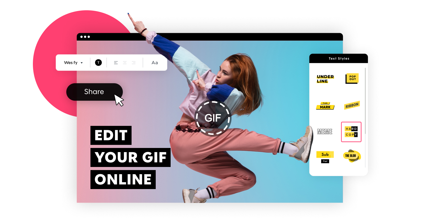 Choose from millions of videos or upload your own. Match them with our custom text styles and create your perfect GIF. Easily edit GIF, resize GIF, and crop GIF as much as you like.