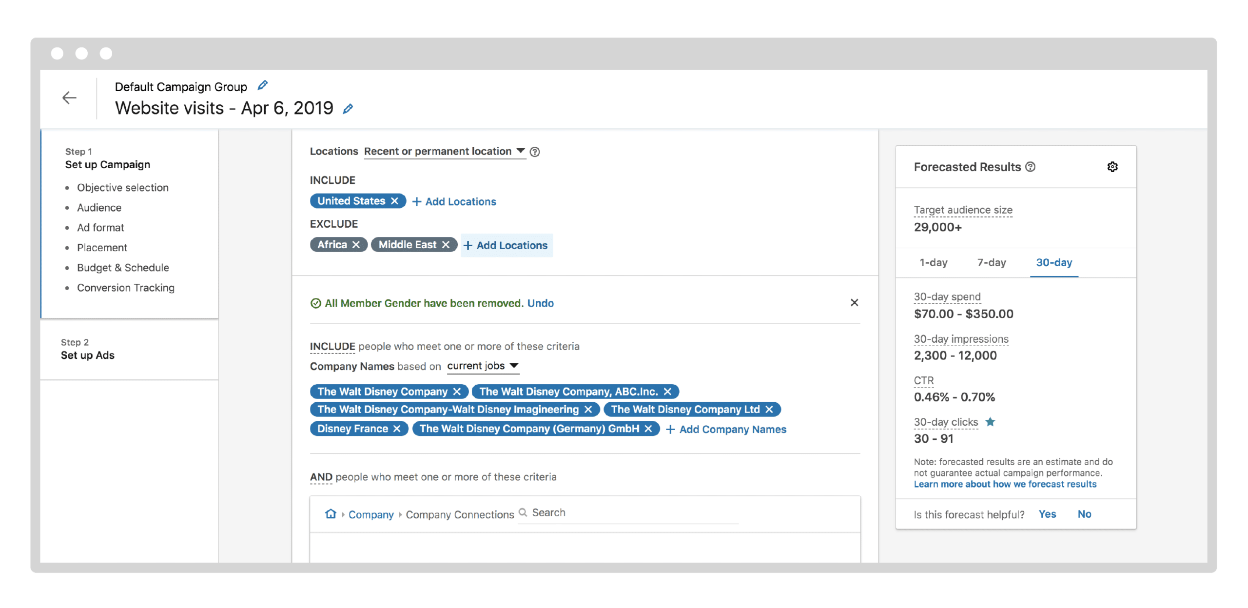 One of the things that we LOVE about the LinkedIn Campaign manager is that as you set up your ad and start to tweak your audience targeting, formats, placement and budget you can see the forecasted cost for your campaign for 1 day, 7 days, or 30 days.