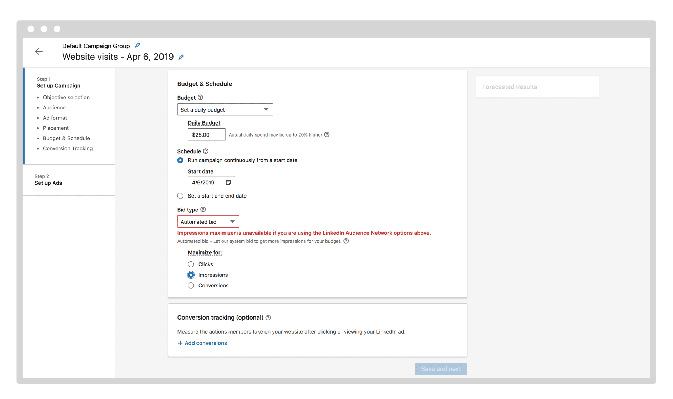If you select a daily budget, LinkedIn will warn you that your ads could end up costing 20% higher than your budget allows.