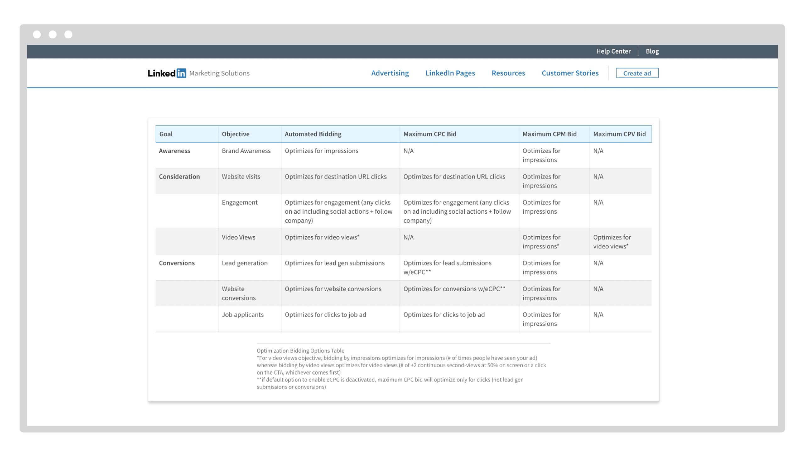 Since LinkedIn’s ads platform works like an auction, you have to bid for a chance to win ad placements. When you choose a bidding strategy, you’re telling LinkedIn what you what you’re willing to spend for various actions.