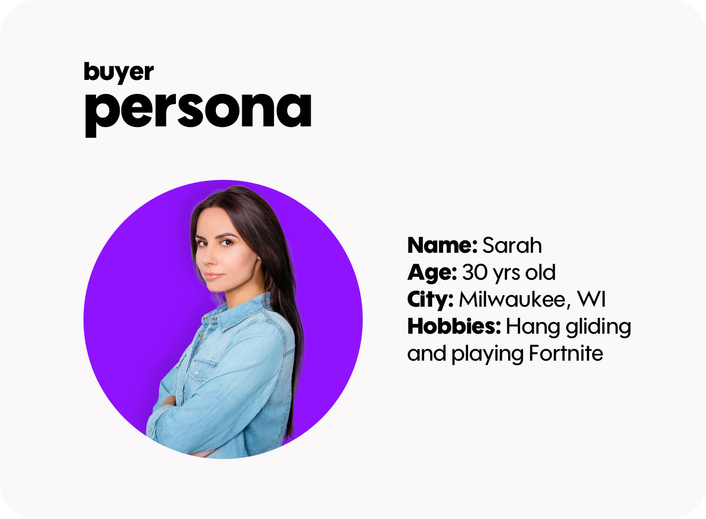 So, let’s say your target audience is 40-year-old women who live in Milwaukee and enjoy hang gliding and playing Fortnite. We’re not sure how large a group that might be, or just what it is you’re selling to these folks; but the point is: you can target them!Example of Buyer PersonaEvery business has a pretty good idea of who their target customer is. So, go forth and target them!