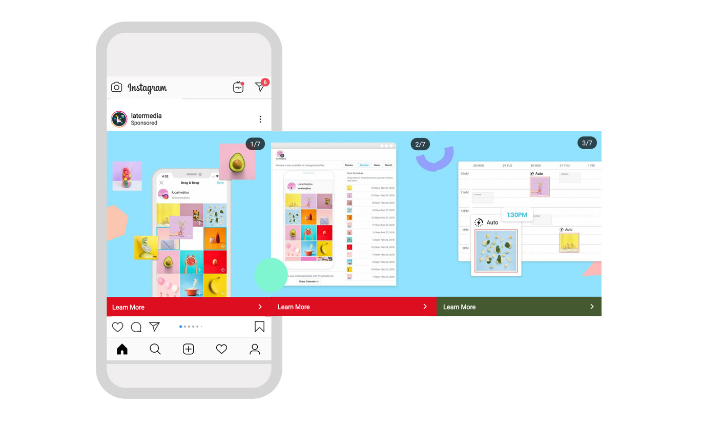 Carousel ads are identical to Facebook’s carousel system, which is a series of pictures and/or videos that are put together and allows users to swipe through the collection. This is a great way to tell a longer story or feature multiple products in the same line.