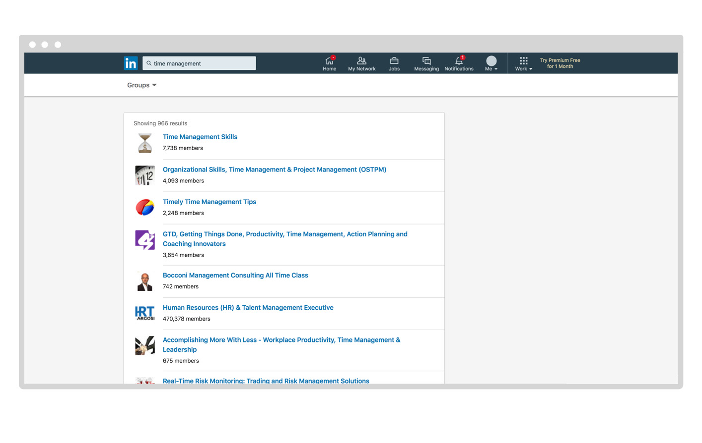 As you can see, there are several options to choose from. Each group is made up of individuals and companies who are interested in video marketing in one way or another. Similar searches will yield similarly helpful results. For example, if your business produces a time management app for business productivity, you might search “time management” in groups to find the most relevant professional network. See the results below.