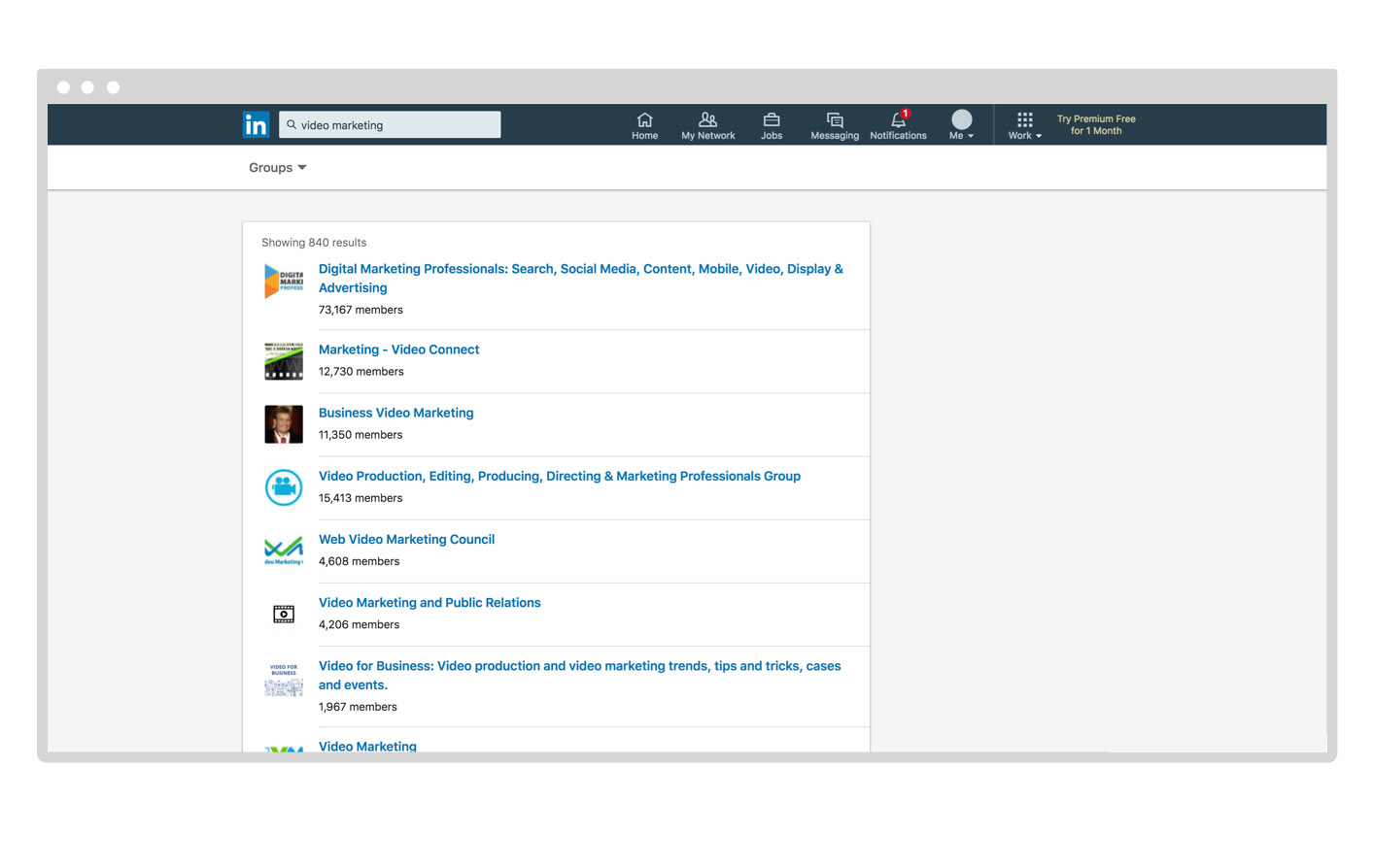 LinkedIn groups are communities on LinkedIn with a specialized focus. For example, below are the results for “video marketing” groups. Join relevant groups and add thoughtful and helpful tips to grow your network and build a professional community.